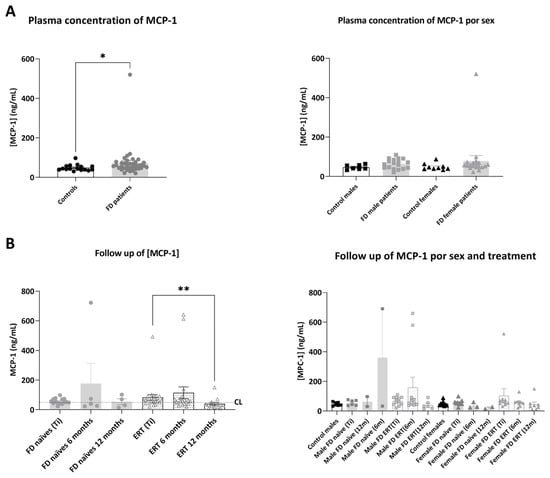 Representation of plasmatic concentration of MCP-1 in the analyzed cohorts. (A) Left graph shows histograms representing mean concentration (mean ± SEM) of MCP-1 (ng/mL) in FD patients (treated or not with ERT) versus healthy controls. The right diagram represents concentrations of the biomarkers in patients and controls divided by sex. (B) Histograms in the left panel represent the mean concentration (mean ± SEM) of MCP-1 in FD naïve and treated patients at different time points (study onset (Ti), 6 and 12 months after Ti). Dotted line CL represents the mean plasmatic concentration in control subjects. In the right panel, evolution of mean concentration of the biomarker in the treatment groups is discriminated by sex. Statistical significance was assessed with one-way ANOVA non-parametric test (Mann–Whitney or Kruskal–Wallis comparisons, * p < 0.05, ** p < 0.01).
