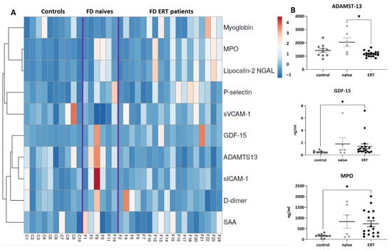 Plasma biomarkers related to cardiovascular risk factors assessed by ELISA-Luminex. (A) Heat map of assessed biomarkers levels indicating Z-score of concentrations in a color grade scale from dark blue (minimum) to dark red (maximum) in each sub-cohort as indicated; purple lines represent separation between groups. Correlations among biomarkers are highlighted. (B) Dot plots indicating plasmatic concentrations (ng/mL) of the analyzed cardiovascular biomarkers (ADAMTS-13, GDF-15, MPO) in FD non-treated patients (naïve), those treated with ERT, and healthy subjects (controls). Statistical significance was assessed with one-way ANOVA non-parametric test (Kruskal–Wallis multiple comparisons, * p < 0.05).