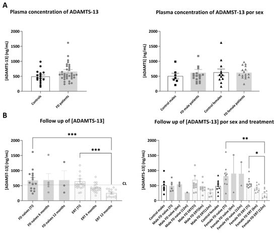 Representation of plasmatic concentration of ADAMTS-13 in the analyzed cohorts. (A) Left graph shows histograms representing mean concentration (mean ± SEM) of ADAMTS-13 (pg/mL) in FD patients (treated or not with ERT) versus healthy controls. The right diagram represents concentrations of the biomarkers in patients and controls divided by sex. (B) Histograms in the left panel represent the mean concentration (mean ± SEM) of ADAMTS-13 in naïve and treated patients at different time points (study onset (Ti), 6 and 12 months after Ti). Dotted line CL represents the mean plasmatic concentration in control subjects. In the right panel, evolution of the biomarker mean concentration in the treatment groups is discriminated by sex. Statistical significance was assessed with one-way ANOVA non-parametric test (Mann–Whitney or Kruskal–Wallis comparisons, * p < 0.05, ** p < 0.01, *** p < 0.001).