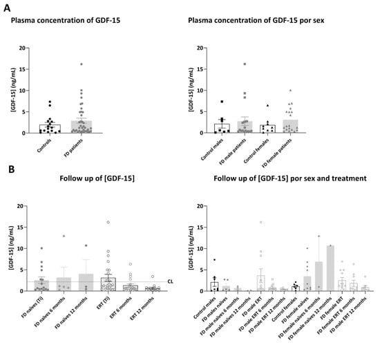 Representation of plasmatic concentration of GDF-15 in the analyzed cohorts. (A) Left graph shows histograms representing mean concentration (mean ± SEM) of GDF-15 (ng/mL) in FD patients (treated or not with ERT) versus healthy controls. The right diagram represents concentrations of the biomarkers in patients and controls divided by sex. (B) Histograms in the left panel represent the mean concentration (mean ± SEM) of GDF-15 in naïve and treated patients at different time points (study onset (Ti), 6 and 12 months after Ti). Dotted line CL represents the mean plasmatic concentration in control subjects. In the right panel, evolution of the biomarker mean concentration in the treatment groups is discriminated by sex. Statistical significance was assessed with one-way ANOVA non-parametric test (Mann–Whitney or Kruskal–Wallis comparisons).