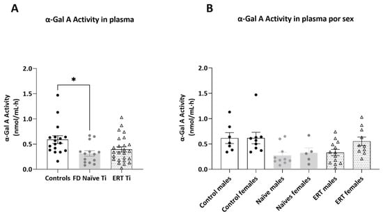 Plasmatic activity levels. Histograms n panel (A) represent plasmatic α-GalA activity ± SEM (nmol/mL·h) in controls (white bars), FD naïve patients (light gray bars), and FD patients treated with ERT (white bars with dots). In panel (B), α-GalA activity values are separated according to sex. Significance was assessed by one-way ANOVA non-parametric test, Kruskal–Wallis multiple comparisons (* p < 0.05).