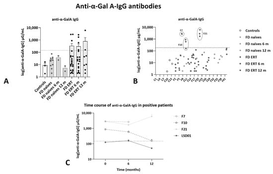 Concentration of anti-α-GalA IgG antibodies was determined in plasma samples (Figure 9). The threshold for anti-α-GalA IgG antibody detection (110 μg/mL) was established above the concentration levels detected for controls and naïve patients. The measurements were carried out in plasma samples instead of serum samples because serum samples were only available for a few subjects. The sensibility of the assay in plasma was reduced, but all the subjects identified as positive were confirmed with a clinically validated assay (performed externally at Labcorp).