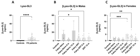 Lyso-GL3 concentration in plasma. Lyso-GL3 concentration in plasma determined by LC-MS in samples from control individuals and patients in treatment or not with ERT (A) Average values (mean ± SEM) in FD patients and healthy controls. (B) Average values (mean ± SEM) for each group in male subjects over 12 months of study. (C) Average values (mean ± SEM) for each group in female subjects. Significance was assessed by one-way ANOVA non-parametric test, Kruskal–Wallis multiple comparisons (* p < 0.05; ** p < 0.01; *** p < 0.001; **** p < 0.0001).