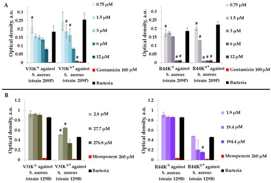 V31KS, R44KS, V31KS*, and R44KS* against S. aureus 209P (A) and 129B (B) strains after 15 h (A) and 24 h (B) of incubation. Bacterial cultures in a liquid medium served as negative controls. Gentamicin sulfate and meropenem antibiotics were used as positive controls. Error bars show standard errors. Number of independent experiments is two. #—for significant differences with negative control p < 0.05.