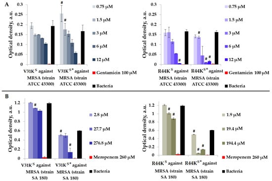 V31KS, R44KS, V31KS*, and R44KS* against MRSA ATCC 43300 (A) and SA 180 (B) strains after 15 h (A) and 24 h (B) of incubation. Bacterial cultures in a liquid medium served as negative controls. Gentamicin sulfate and meropenem antibiotics were used as positive controls. Error bars show standard errors. Number of independent experiments is two. #—for significant differences with negative control p < 0.05.