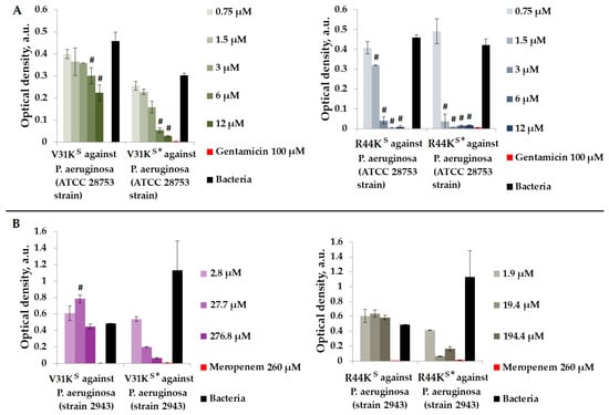 V31KS, R44KS, V31KS*, and R44KS* against P. aeruginosa ATCC 28753 (A) and 2943 (B) strains after 15 h (A) and 24 h (B) of incubation. Bacterial cultures in a liquid medium served as negative controls. Gentamicin sulfate and meropenem antibiotics were used as positive controls. Error bars show standard errors. Number of independent experiments is two. #—for significant differences with negative control p < 0.05.