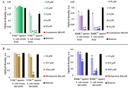 V31KS, R44KS, V31KS*, and R44KS* against E. coli K12 (A) and MG1655 (B) strains after 15 h (A) and 24 h (B) of incubation. Bacterial cultures in a liquid medium served as negative controls. Gentamicin sulfate and meropenem antibiotics were used as positive controls. Error bars show standard errors. Number of independent experiments is two. #—for significant differences with negative control p < 0.05.