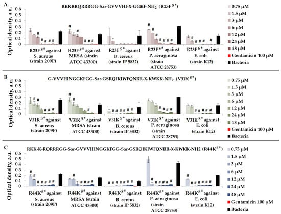 Results of R23FS* (A), V31KS* (B), and R44KS* (C) test for antimicrobial effect against S. aureus (strain 209P), MRSA (strain ATCC 43300), B. cereus (strain IP 5832), P. aeruginosa (strain ATCC 28753), and E. coli (strain K12) after incubation for 15 h. The antibiotic gentamicin sulfate was used as a positive control. The concentration of gentamicin was 100 µM. Cell cultures in a liquid medium (Mueller–Hinton Broth) served as a negative control. Error bars show standard errors. Number of independent experiments is two. #—for significant differences with negative control p < 0.05.