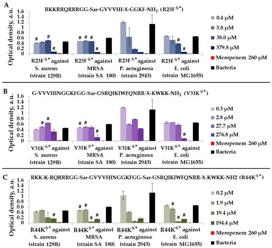 Results of R23FS* (A), V31KS* (B), and R44KS* (C) tests for antimicrobial effect against S. aureus (strain 129B), MRSA (strain SA 180), P. aeruginosa (strain 2943), and E. coli (strain MG1655) after incubation for 24 h. The antibiotic meropenem was used as a positive control. The concentration of meropenem was 260 µM. Cell cultures in a liquid medium (Mueller–Hinton Broth) served as a negative control. Error bars show standard errors. Number of independent experiments is two. #—for significant differences with negative control p < 0.05.