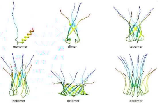 An increase in the peptide concentration up to 40 μg/mL affected membrane stability and triggered its rupture, causing a detergent action. As a rule, at subthreshold concentrations, R44KS was able to induce single step-like current fluctuations (inset in Figure 7A), which should be attributed to ion-permeable transmembrane pores. Figure 7B shows that the current fluctuations related to the functioning of R44KS-produced pores were observed at various transmembrane voltages. The single pores were characterized by different amplitudes with conductance varying in the range of 10–30 pS. The variability in conductance states could be attributed to the formation of barrel oligomers by R44KS, as predicted by AlphaFold 2 (Figure 8).