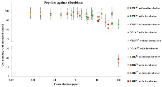The peptides were pre-incubated for 12 h in DMEM medium without serum in a CO2 incubator. After the incubation period, serum was added to the medium to a final concentration of 10%, and the preparation was added dropwise onto the cells. The cytotoxic effects of peptides against eukaryotic cells (human fibroblasts and BT474) were subsequently assessed using the same method as in the previous study [].
