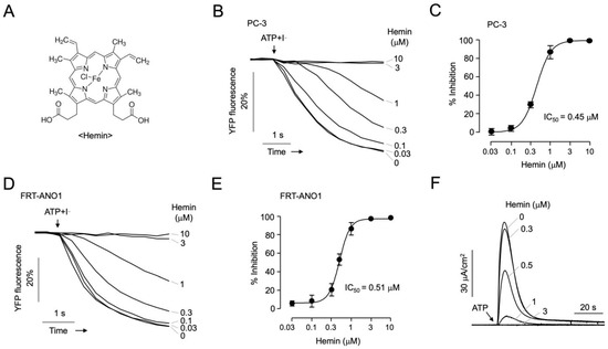 We performed a cell-based screening of a chemical library containing 2978 approved and investigational drugs to identify novel ANO1 inhibitors using the YFP fluorescence quenching assay. The functional activity of ANO1 chloride channel was evaluated via stable transfection of iodide-sensing mutant YFP (F46L/H148Q/I152L) into PC-3 cells with high endogenous ANO1 expression. Eleven compounds that blocked more than 80% of iodide influx through ANO1 were identified as hits, including previously known ANO1 inhibitors such as benzbromarone, dichlorophen, sanguinarine chloride, and diethylstilbestrol [22,28]. Notably, hemin emerged as the only potent new inhibitor showing selectivity for ANO1. The chemical structure of hemin is shown in Figure 1A. In PC-3 cells, hemin potently inhibited ANO1 channel activity with IC50 value of 0.45 μM (Figure 1B,C).
