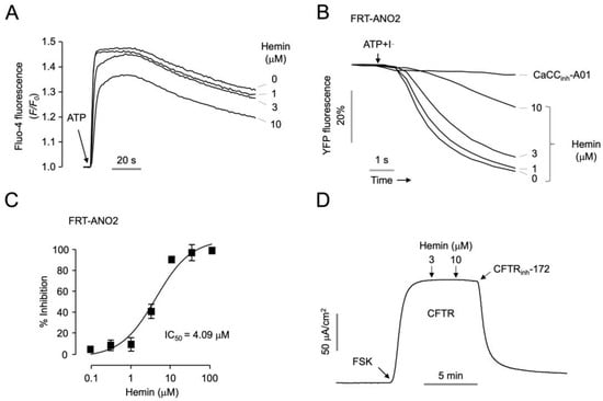 Characterization of the novel ANO1 inhibitor, hemin. (A) Intracellular calcium level was measured using Fluo-4 assay in PC-3 cells. The indicated concentration of hemin was treated for 10 min, and then ATP (100 μM) was applied. (B) Inhibitory effect of hemin on ANO2 determined by YFP fluorescence quenching assay. CaCCinh-A01 (10 µM) and the indicated concentrations of hemin were administered for 10 min prior to ATP (100 μM) treatment. (C) Dose–response curve on ANO2 inhibitory activity; nH = 2.5 (mean ± S.D.; n = 5). (D) CFTR activity was measured in FRT cells expressing human CFTR. CFTR chloride currents were activated by 10 μM of forskolin (FSK), and then the indicated concentrations of hemin and CFTRinh-172 (10 μM) were applied.