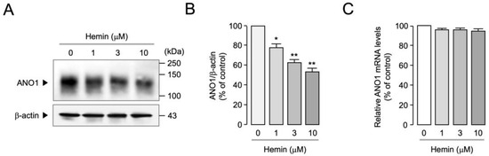 To observe the effect of hemin on ANO1 protein expression levels, Western blot analysis was performed in PC-3 cells. Remarkably, hemin reduced ANO1 protein expression levels in a dose-dependent manner (Figure 3A,B). Real-time PCR analysis was performed to investigate whether hemin affects ANO1 mRNA expression levels. As shown in Figure 3C, hemin did not alter the mRNA expression levels of ANO1.