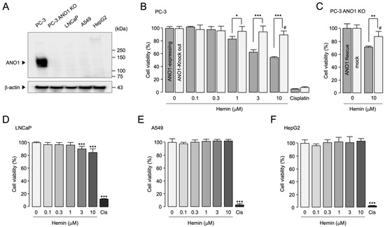 Expression levels of ANO1 protein and effect of hemin on cell viability in PC-3, LNCaP, A549, and HepG2 cells. (A) ANO1 protein expression levels in PC-3, PC-3 ANO1 knockout (KO), LNCaP, A549, and HepG2 cells. (B) Cell viability was assessed in PC-3 and PC-3 ANO1 KO cells. Cells were incubated with hemin at the indicated concentrations for 72 h, and medium was replaced every 24 h (mean ± S.D.; n = 5). * p < 0.05, *** p < 0.001; # p < 0.05 vs. ANO1 KO group control. (C) Cell viability was assessed in PC-3 ANO1 KO cells subjected to either mock transfection or ANO1 transfection. Cells were incubated with 10 μM of hemin for 72 h, and medium was replaced every 24 h (mean ± S.D.; n = 6). ** p < 0.01; # p < 0.05 vs. mock group control. (D–F) LNCaP, A549, and HepG2 cells were treated with hemin at the indicated concentrations for 72 h, and medium was changed every 24 h (mean ± S.D.; n = 5). Cisplatin was treated at 50 μM. *** p < 0.001 vs. control.