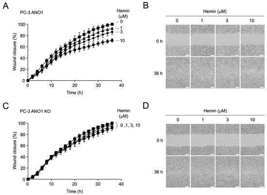 To observe whether hemin inhibits cell migration in an ANO1-dependent manner, we performed wound healing assays in PC-3 and PC-3 ANO1 KO cells. Interestingly, hemin significantly reduced cell migration in a dose-dependent manner in PC-3 cells (Figure 5A,B). However, hemin had no significant effect on cell migration of PC-3 ANO1 KO cells, which do not express ANO1 (Figure 5C,D).