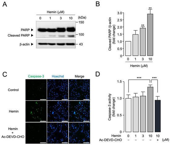 Effect of hemin on PARP cleavage and caspase-3 activity in PC-3 cells. (A) PC-3 cells were treated with 1, 3, 10 µM of hemin for 24 h, and then the expression levels of PARP, cleaved-PARP, and β-actin were analyzed via Western blot analysis. (B) Cleaved PARP intensity was normalized to β-actin (mean ± S.E., n = 3). ** p < 0.01 vs. control. (C) Images were taken 24 h after application of 10 µM of hemin in PC-3 cells, and then cells were incubated with 1 µM of caspase-3 substrate (green) and 1 µM of Hoechst 33342 (blue) for 30 min prior to image acquisition. Scale bars represent 200 µm. (D) PC-3 cells were treated with the indicated concentrations of hemin in the presence or absence of 20 µM of Ac-DEVD-CHO for 24 h and then treated with 1 µM of caspase-3 substrate for 30 min to estimate caspase-3 activity. *** p < 0.001.