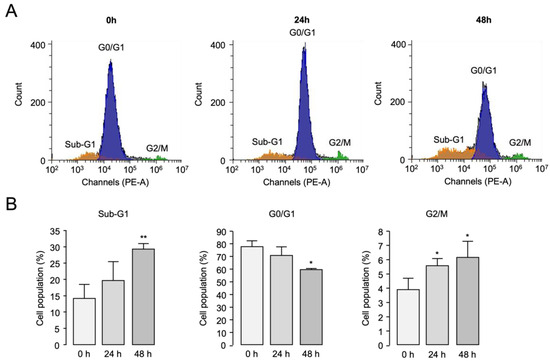 Effect of hemin on cell cycle in PC-3 cells. (A,B) Cell cycle phases were observed via propidium iodide (PI) staining followed by flow cytometric analysis after cells were treated with 3 μM of hemin for 24 h and 48 h (mean ± S.D.; n = 3). * p < 0.05, ** p < 0.01 vs. control.