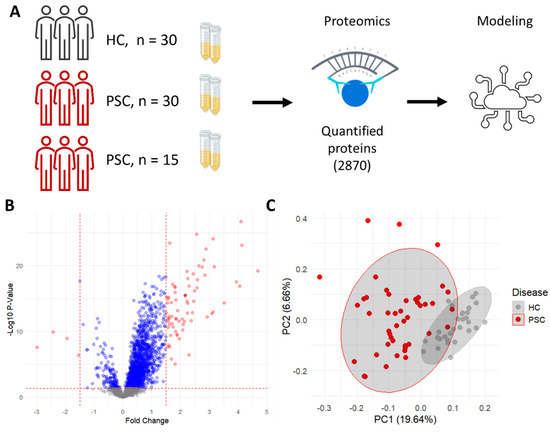 Proteomic profiling demonstrates unique protein expression in PSC patients. (A) In the data acquisition process, serum was taken from three cohorts of individuals, quantified by the real-time PCR-based proximity extension assay (PEA) and used to model disease presence. (B) Volcano plot showing the fold change (red points represent FC > 1.5, blue points represent FC < 1.5) and −Log10 of the p-value from a Welch two-sample t-test between HC and PSC patients. (C) Principal component analysis showing the separation of HC and PSC patients.