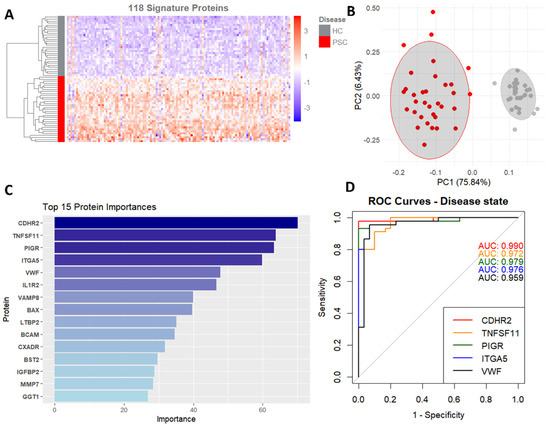 To uncover which proteins are most likely associated with the presence of PSC, an elastic net model was trained. This model was chosen based on its ability to account for the high dimensionality of our data and prevent overfitting. The trained model successfully predicted the disease state, with an accuracy of 0.98 (CI 0.96–1) and an AUC of 0.99 (CI 0.98–1). Top contributing proteins (Figure 2A) were estimated by repeating the modeling step 500 times and averaging the importance score, and proteins with an average importance of 1 or greater (n = 118) were considered relevant. A PCA plot (Figure 2B) was generated using this subset of the data and shows a strong separation of the population for disease presence.