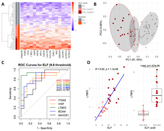 Association of model to disease severity. (A) Heatmap of protein signature for PSC and ELF score, showing hierarchical clustering of HC and patients with PSC with low (<9.8) and high (>9.8) ELF scores. (B) PCA using only the proteins used for the heatmap. (C) ROC curves and area under the curve for the top five proteins predicting both disease and ELF score. (D) Correlation and t-test of LTBP2 and ELF, both as a continuous variable and stratified by 9.8 threshold.