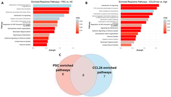 CCL24 is associated with disease-related biological pathways. (A) Reactome pathways enriched for PSC/HC. (B) Reactome pathways enriched for CCL24 high/low (C) Venn diagram of the overlap between pathways enriched for proteins that contributed to the PSC/HC model and proteins that were differentially expressed in PSC patients with high/low levels (by median NPX value) of CCL24.