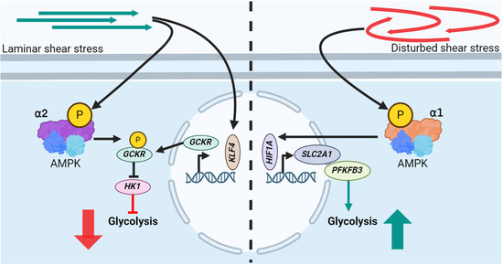 An intriguing aspect of EC metabolism in response to flow is that ECs downregulate glycolysis when exposed to LSS, independent of AMPK via Krüppel-like factor 2 (KLF2)-mediated PFKFB3 repression [18] but also via AMPK-dependent pathways [49]. Vice versa, it was reported that OF upregulates glycolysis in ECs [50,51]. LSS or pulsatile shear stress (PSS) mediated downregulation of glycolysis was found to be regulated to a large extent by KLF4 and AMPK. Initially, PSS induces the transcription of glucokinase regulatory protein (GCKR) via KLF4. Furthermore, pulsatile flow (PF) activates AMPK, which subsequently phosphorylates GCKR at Ser481 to subsequently increase its interaction with hexokinase 1 (HK1). The GCKR-mediated inhibition of HK1 is associated with the suppression of glucose conversion into glucose 6-phosphate, a pivotal stage in glycolysis [49] (Figure 2, left). Further investigation of this pathway in mice indicated that AMPKα2 is the responsible AMPK subunit for the PSS-induced downregulation of glycolysis [49]. In contrast, an increased activation of AMPKα1 in ECs after exposure to DF was shown to result in an increase in glycolysis via mediating an upregulation of HIF1a expression. The latter results, subsequently, in increased transcription of glycolytic genes, such as SLC2A1 and PFKFB3 [52] (Figure 2, right). Interestingly, the authors furthermore reported that inhibiting AMPKα1 under DF decreases glycolytic rates, which resulted in decreased EC viability [52]. These findings demonstrate that discrete AMPK subunits are selectively activated by LSS or DSS, eliciting different physiological responses.