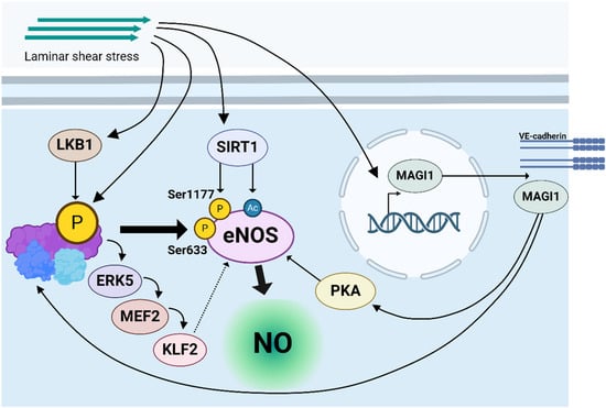 Further investigations revealed that shear stress-activated AMPK phosphorylates eNOS at Ser633 and Ser1177 [45,71]. A synergistic role for AMPK and SIRT1 (Sirtuin1), a key regulator of stress responses and energy homeostasis, in activating eNOS upon exposure to LF, but not OF, was demonstrated in HUVECs. As such, AMPK-mediated eNOS phosphorylation induces SIRT1-mediated eNOS deacetylation, which leads to enhanced NO production and stimulation of an atheroprotective phenotype in LF conditions [73]. An additional pathway of flow-mediated eNOS activation via MAGI1 (MAGUK with inverted domain structure-1) was reported in 2019 [74]. This study shows that fluid shear stress induces MAGI1 transcription, initiating AMPK and protein kinase A (PKA) activation, which synergistically activates eNOS [74]. Finally, an additional AMPK-dependent, KLF2-mediated eNOS activation pathway induced by PSS or LSS was identified. The authors reported that shear stress activated AMPK in HUVECs and observed downstream phosphorylation of ERK5 and MEF2, which subsequently induced KLF2-mediated eNOS upregulation, likely by increasing its expression. This demonstrates a novel AMPK/ERK5/MEF2/KLF2 pathway in shear-dependent eNOS activation [61]. Altogether, these data show that AMPK is at the center of mechanosensing pathways that activate eNOS upon LF, thereby increasing NO bioavailability and promoting endothelial function in regions exposed to LF (graphical summary: Figure 3).