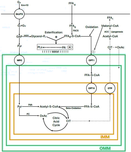 Scheme of the metabolic regulation of the balance between fatty acid esterification and oxidation regulated by the “fuel sensor” of acetyl-CoA carboxylase (ACC I and II). Citrate (CIT), phosphatidic acid (PA), phospholipids (PLS), fatty acids (FFAs), oxalacetate (OxAc), pyruvate (Pyr), glucose (G), carnitine palmitoyl transferase I (CPTI), fatty acyl-CoA synthetase (FAS), pyruvate dehydrogenase (Pdh), pyruvate carboxylase (Pc), mitochondrial pyruvate carrier (MPC), citrate transport protein (CTP), mitochondria-associated membranes (MAMs), inner mitochondrial membrane (IMM), outer mitochondrial membrane (OMM), endoplasmic reticulum (ER). The dotted line represents the lipogenesis pathway, which is weakly expressed in islet cells but is necessary to control the balance between FFA oxidation and esterification by malonyl-CoA. The broken line represents the branched pathway of phospholipid synthesis after the esterification of FFA to glycerol-3-phosphate. The subscripts “o” and “i” in G and FFAs refer to the extra- and intracellular concentrations of glucose and FFAs, respectively.