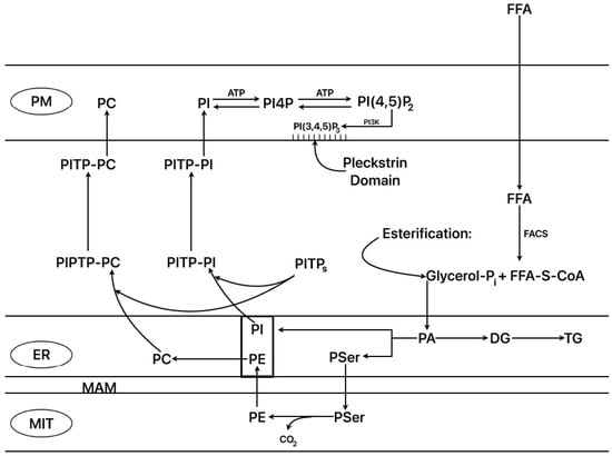 It is known that synthesis of the more abundant phospholipids of the inner mitochondrial membrane (PE and PC) takes place in specific locations in the endoplasmic reticulum associated with the mitochondria (mitochondria-associated membranes, or MAMs) and then is transferred to the mitochondria []. A positive correlation between mitochondrial ATP and PE contents in hepatoma cells has been demonstrated, together with an increased respiratory rate after downregulation of phosphatidylethanolamine N-methyltransferase (PEMT) that results in the elevation of mitochondrial PE content []. Fasting triggers the so-called “adaptive response to fasting” [] that moderates FFA oxidation, stimulating the synthesis of the enzyme methionine S-adenosyl transferase (MAT I) in the mitochondria-associated membranes (MAMs) of the endoplasmic reticulum tethered to the mitochondria (ER–mitochondria junctions). MAT I catalyzes the trimethylation of PE to PC at the expense of S-adenosyl methionine in the major organ systems, liver, brain, and adipose tissue. Small variations in the PC/PE molar ratio may contribute to the development of non-alcoholic fatty liver disease (NAFLD) in humans, and ratios below 1 may induce liver failure []. To our knowledge, its activity and/or function have not yet been explored in pancreatic islets. Anyhow, it has been shown that starvation of rats for 48 h significantly suppressed the islet amount of PC and PE by 3- and 2-fold, respectively, suppressing their corresponding ratio by 54% in comparison with control fed islets []. Moreover, it is known that the main phospholipids (PC, PI) synthesized in the ER are transferred to the plasma membrane by means of the “phosphatidyl inositol transfer proteins” (PIPT α, β, and more) (Figure 2) []. Plasma membrane PI is repeatedly phosphorylated by PI4-kinase and PI4P-5kinase to PI(4,5)P2. Phospholipase C activation occurs via G-protein-coupled receptors or via increases in cytosolic Ca2+ in the micromolar range, hydrolyzing PI(4,5)P2 to I(1,4,5)P3 (IP3) and DG. These two messengers and their precursors are rapidly depleted and have to be replaced by importing PI from the ER via some PITP forms. Readers interested in more detailed information about the cellular cyclic system that regulates the replenishment of PI and its two main phosphorylated species at the plasma membrane may consult reference []. There is also information on the possible roles of PI phosphorylated forms on exocytosis and ion channel regulation []. PITP, PI(4,5)P3, and other lipids (FFA, PA, cholesterol) have been implicated in post trans-Gogi network secretory vesicle formation (vesicle budding and fission) and their docking and priming at the plasma membrane [,].