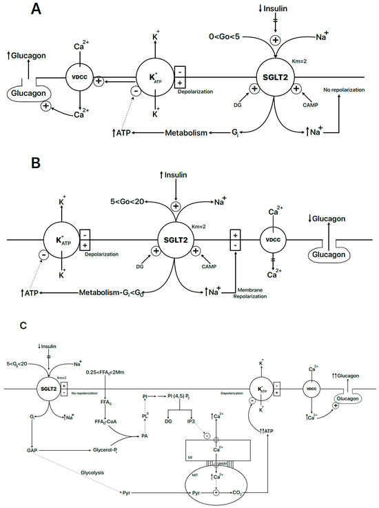 (A). Hypothetical stimulus–secretion coupling mechanism of glucagon secretion by glucose in the range from 0 to 5 mM. Sodium–glucose cotransporter 2 (SGLT2), voltage-dependent calcium channel (VDDC), diacylglycerol (DG). (B). Hypothetical mechanism of inhibition of glucagon secretion via stimulation of insulin secretion in the glucose range from 5 to 20 mM. Symbols are the same as in (A). (C). Hypothetical stimulus–secretion coupling mechanism of glucagon secretion by glucose in the range from 5 to 20 mM under hyperglycemic, hypo-insulinemic, and hyperlipidemic conditions (glucose intolerance and diabetes). It is assumed that plasma FFAs are close to 2 mM. Inositol (3,5), trisphosphate (IP3). Other symbols are the same as in (A,B).