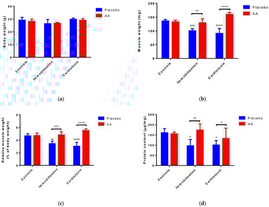 Impact of AA on skeletal muscle mass. (a) Mice body weight; (b) Tibialis anterior (TA) muscle weight; (c) TA weight relative to body weight; (d) Protein content in TA muscle. Data are expressed as mean ± standard deviation of 5 different experiments. Statistical differences were assessed by two-way analysis of variance (ANOVA) and Tukey’s post hoc test. ^ = p < 0.05, ^^ = p < 0.01, ^^^ = p < 0.001, ^^^^ = p < 0.0001 vs. control groups; * = p < 0.05; ** = p < 0.01; *** = p < 0.001, **** = p < 0.0001 vs. placebo groups.