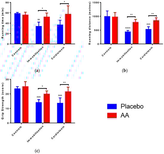 Impact of AA on skeletal muscle performance. (a) Running duration for treadmill test; (b) Running distance for treadmill test; (c) Hind limb force score for grip strength test. Data are expressed as mean ± standard deviation of 5 different experiments. Statistical differences were assessed by two-way analysis of variance (ANOVA) and Tukey’s post hoc test. ^ = p < 0.05, ^^ = p < 0.01, ^^^ = p < 0.001, ^^^^ = p < 0.0001 vs. control groups; * = p < 0.05; ** = p < 0.01 vs. placebo groups.
