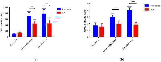 Impact of AA on skeletal muscle damage. (a) Serum lactate dehydrogenase (LDH) activity; (b) Serum creatin phosphokinase (CPK) activity. Data are expressed as mean ± standard deviation of 5 different experiments. Statistical differences were assessed by two-way analysis of variance (ANOVA) and Tukey’s post hoc test. ^^^ = p < 0.001, ^^^^ = p < 0.0001 vs. control groups; ** = p < 0.01, *** = p < 0.001, **** = p < 0.0001 vs. placebo groups.