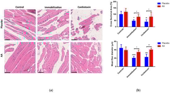 Muscle architecture was analyzed by hematoxylin and eosin staining, and representative images are shown in Figure 4a. An effect of both the model and treatment on cross-sectional area was observed (F2,24 = 13.60, p = 0.0001; F1,24 = 12.36, p = 0.0018, respectively), and a model (F2,24 = 13.09, p = 0.0001), treatment (F1,24 = 14.67, p = 0.0008) and interaction (F2,24 = 9.272, p = 0.001) effect on the mean fiber diameter of TA muscle was described. Both variables were reduced in the immobilization and cardiotoxin models treated with the placebo but not in those treated with AA supplementation (Figure 4b). Similar results were obtained by analyzing the fiber size distribution (Figure S1).