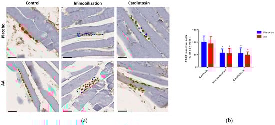 To investigate the effect of AA treatment on skeletal muscle regeneration after 10 days, the number of PAX7-positive cells in TA muscle was quantified by digital pathology (representative hotspot images are shown in Figure 5a). Of note, a model effect was observed (F2,24 = 13.66, p = 0.0001), with a significant decrease in both the immobilization and cardiotoxin groups, irrespective of treatment (Figure 5b).