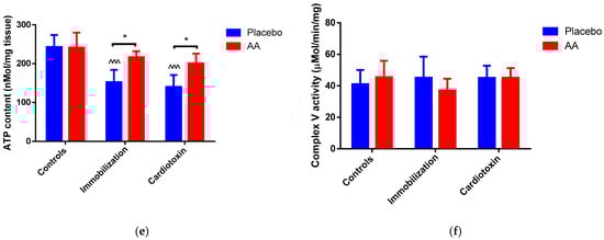 To verify whether changes in mitochondrial bioenergetics would cause modifications of ATP homeostasis in models of skeletal muscle atrophy, ATP content was measured in TA muscle and compared to the activity of Complex V (ATP synthase). Interestingly, an effect of the model (F2,24 = 16.43, p < 0.0001), treatment (F1,24 = 14.39, p = 0.0009) and interaction (F2,24 = 3.914, p = 0.0338) on ATP content was observed. In particular, with respect to the control animals, the ATP content was significantly reduced in the immobilization and cardiotoxin groups treated with the placebo but not in mice treated with AA (Figure 6e). On the contrary, no modifications were observed in Complex V (ATP synthase) activity between all the groups studied (Figure 6f).