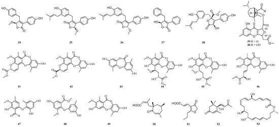 - Chen, Y.; Sun, L.T.; Yang, H.X.; Li, Z.H.; Liu, J.K.; Ai, H.L.; Wang, G.K.; Feng, T. Depsidones and diaryl ethers from potato endophytic fungus Boeremia exigua. Fitoterapia 2020, 141, 104483. [Google Scholar] [CrossRef] [PubMed]