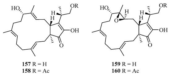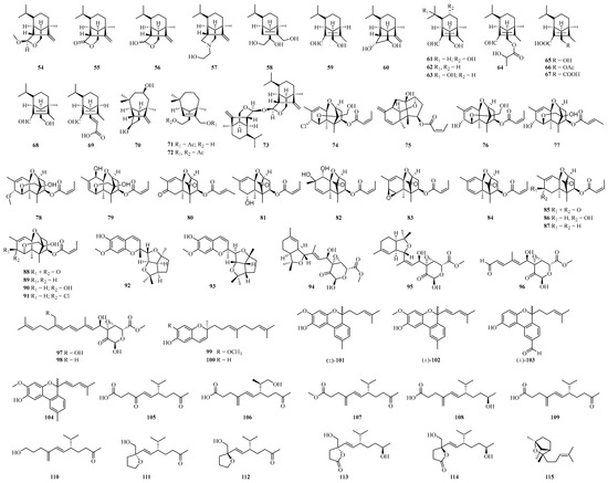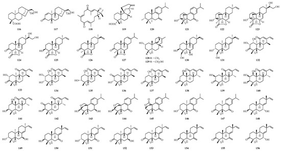 - Zhang, X.T.; Zheng, M.J.; Fu, A.M.; Li, Q.; Chen, C.M.; Zhu, H.C.; Zhang, Y.H. Natural Sesquiterpenoids, Diterpenoids, Ses-terterpenoids, and Triterpenoids with Intriguing Structures from 2017 to 2022. Chin. J. Chem. 2023, 41, 3115–3132. [Google Scholar] [CrossRef]