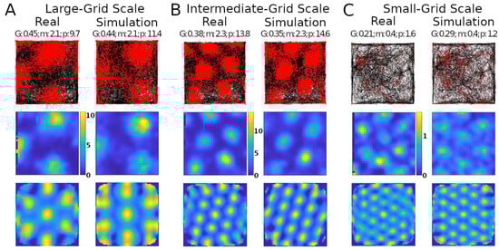 Comparing simulated and real results. Panels (A–C) show results with different grid scales. Values reported at the top of the panels are grid score (G), mean firing rate in spikes/s (m), and peak firing rate, also in spikes/s (p). Top row: trajectory of animal in the environment (black lines) and spike location (red markers). Middle row: firing rate map of the neuron (color scale bars in spikes/s). Bottom row: autocorrelogram of the rate map (color bar ranges: (A), −74% [percent is relative to maximum correlation] to 100%; (B), −51% to 100%; (C), −60% to 100%).
