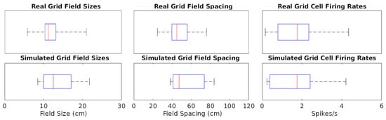 We also measured and compared grid field sizes and spacing between real and simulated recordings (see Supplementary Materials VI for methods). These comparisons utilize the same cells used in the firing rates analyses and the Wilcoxon test for the same reasons described for firing rates. The grid field sizes of real cells had a median of 11.16 cm and IQR of 2.79 cm, and simulated cells had a median of 11.23 cm and IQR of 4.74 cm (Figure 2). Grid field spacing in real cells had a median of 44.87 cm and IQR of 16.03 cm, and simulated cells had a median of 43.56 cm and IQR of 15.53 cm. The p-value for sizes was 0.70 and for spacing 0.71, both indicating a lack of support for the hypothesis that field sizes and spacings have different distributions between simulated and real cells.