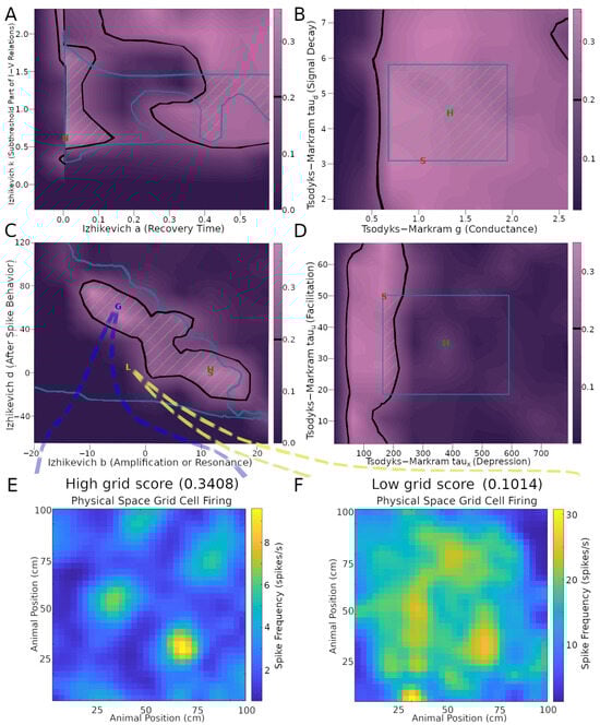To evaluate how well the firing activity of a stellate cell reflected a grid pattern, we utilized a numerical score (grid score) previously introduced to quantify experimental data []. We chose a grid score threshold of 0.2 as an indicator of an acceptable grid pattern after a review of many plots with different scores. In these parameter exploration analyses, for computational practicality, we used a shorter simulation time than the full animal experiment time (see Supplementary Materials I for additional details).