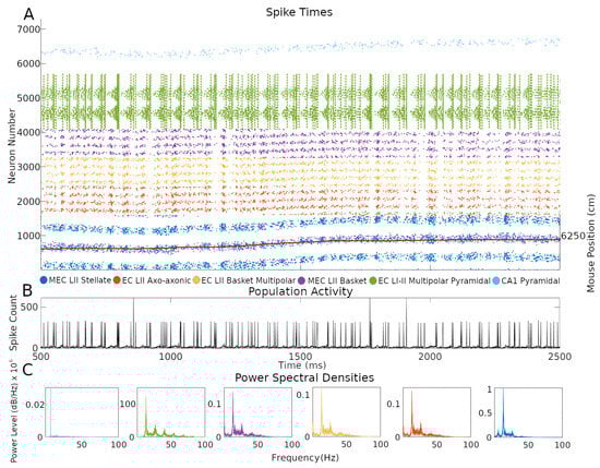 Neuron type-specific spiking dynamics. (A) Raster plot of the spiking of all neurons during two seconds of simulation of animal data. This activity was from the simulation in Figure 1B. The red line represents the movement path of a mouse that was used as velocity input into the simulation: the corresponding right y-axis label represents two-dimensional environment position converted to one-dimension with the formula, where y is the y-axis location position, x is the x-axis location position, and is the length of the x-axis in cm. (B) Population activity from the combined spiking of all simulated neurons in MEC LII, namely grid cells, INs, and CjCs. (C) Power spectral densities of neural spiking during the first minute of the simulation. The spiking in each plot is from all neurons within each color-coded neuron type group.