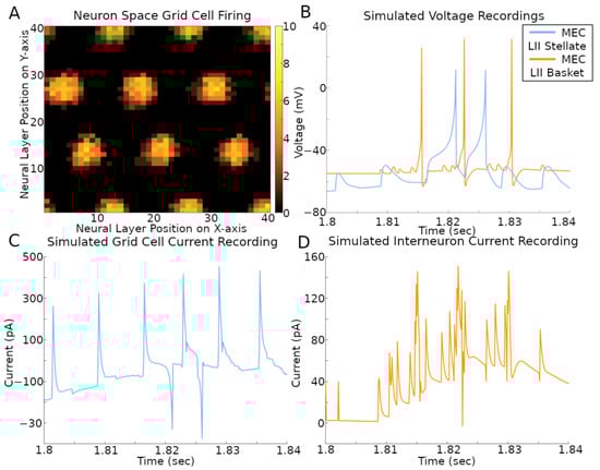 Simulated voltage and current. The simulation settings were those used to create results in Figure 1B. (A) Rate map of all grid cell spiking within a 400 ms time span. The color bar on the right is the count of spikes in that time period. (B–D) Recordings during that same time span of a stellate cell and IN with x- and y-axis position (2, 1) in their respective neural layers.