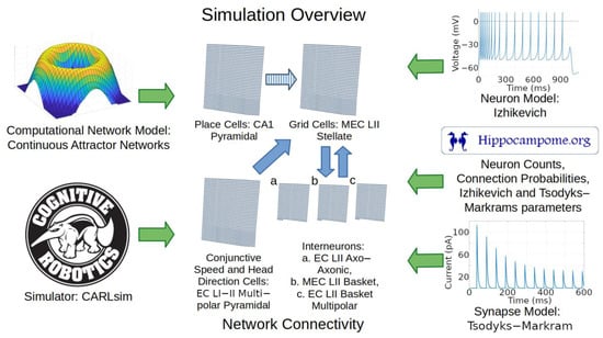 The hippocampus and surrounding circuits, including the entorhinal cortex, play a crucial role in representing and associating space, context, and episodic memory. Despite remarkable advances in characterizing the molecular and cellular properties of hippocampal neurons, a coherent framework to link this wealth of data with network-level computational functions is still missing. Simulating cells involved in spatial cognition with detailed levels of physiological realism may foster mechanistic investigations of their roles in spatial navigation. Grid cells are place-modulated neurons with firing fields at multiple discrete and periodically spaced locations []. These fields form a hexagonal pattern that tiles the entire space available to the animal. Many computational simulations have helped advance theories on how grid cells and other cellular activities are involved in spatial representation [,,,]. Continuous attractor networks (CANs) are a major class of computational models used to recreate grid cell activities [].