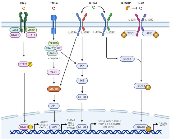 Figure 1 summarizes the signaling pathways that are activated in keratinocytes by cytokines such as interleukin (IL)-17A, IL-22, interferon (IFN)-γ, and tumor necrosis factor (TNF)-α secreted by various immune cells. This section presents an in-depth analysis of the molecular and cellular mechanisms underlying psoriasis pathogenesis, specifically in keratinocytes. Keratinocytes are the predominant cell type of the epidermis; they play a pivotal role in the development and persistence of psoriatic lesions [10,11,12]. This section examines the intricate network of cytokines, signaling cascades, and transcriptional regulators that promote the hyperproliferation, aberrant differentiation, and chronic inflammation observed in psoriatic keratinocytes.