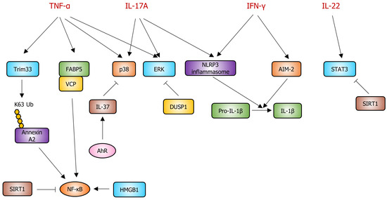 Putative molecular targets and their associated signaling pathways for psoriasis in keratinocytes. TNF-α activates Trim33, which induces K63 ubiquitination of annexin A2. Subsequently, K63 ubiquitination of annexin A2 activates the NF-κB signaling pathway. TNF-α also activates the FABP5-VCP complex, which in turn activates NF-κB. SIRT1 inhibits NF-κB signaling, while HMGB1 activates it. IL-17A or TNF-α activates p38, promoting psoriasis development. AhR increases IL-37 expression, and increased IL-37 inhibits p38 activity. TNF-α or IL-17A activates ERK, while DUSP1 inhibits the ERK pathway. IL-17A or IFN-γ activates the NLRP3 inflammasome, which converts pro-IL-1β to IL-1β. Activated IL-1β is involved in psoriasis pathogenesis. IFN-γ activates AIM-2, which also converts pro-IL-1β to IL-1β. IL-22 activates STAT3, and SIRT1 inhibits STAT3 activity. Sharp arrows (→) indicate activation, and blunt arrows (⊣) indicate inhibition. Yellow circles represent K63 ubiquitination of annexin A2.