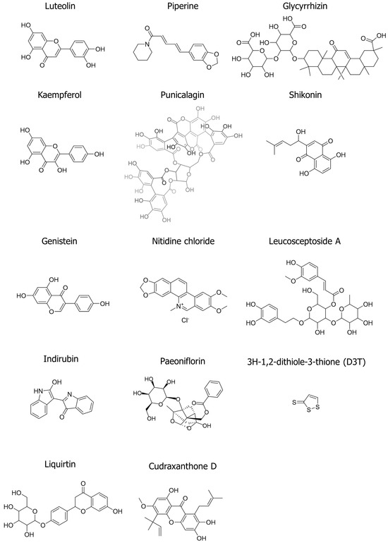 Chemical structures of natural product-derived compounds used in psoriasis treatment. The figure shows the chemical structures of 14 different compounds (luteolin, piperine, glycyrrhizin, kaempferol, punicalagin, shikonin, genistein, nitidine chloride, leucosceptoside A, indirubin, paeoniflorin, 3H-1,2-dithiole-3-thione (D3T), liquirtin, and cudraxanthone D). The chemical structures were generated using ChemDraw (Ver. 23.1.1).