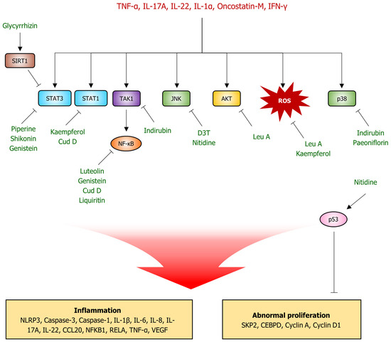 Potential molecular targets of natural product-derived compounds for psoriasis treatment. TNF-α, IL-17A, IL-22, IL-1α, Oncostatin-M, and IFN-γ promote the activation of STAT3, STAT1, TAK1/NF-kB, JNK, AKT, and p38 signaling systems, as well as ROS production. These signaling pathways and ROS production lead to inflammatory responses by increasing the expression or protein levels of NLRP3, caspase-3, caspase-1, and others in keratinocytes. They also contribute to abnormal keratinocyte proliferation by increasing the levels of SKP2, CEBPD, cyclin A, and cyclin D1. Piperine, shikonin, and genistein inhibit STAT3, while glycyrrhizin inhibits STAT3 activity through SIRT1 activation. Kaempferol and cudraxanthone D (Cud D) also inhibit STAT1 activity. Luteolin, genistein, Cud D, and liquirtin inhibit NF-kB transactivity, whereas indirubin inhibits NF-kB signaling by inhibiting TAK1 activity. 3H-1,2-dithiole-3-thione (D3T) and nitidine inhibit the JNK signaling pathway, a member of the MAPK signaling system, and indirubin and paeoniflorin inhibit p38, another signaling pathway. Leucosceptoside A (Leu A) inhibits the PI3K/AKT signaling pathway, while Leu A and kaempferol inhibit ROS overproduction. Furthermore, p53 is known to inhibit excessive keratinocyte proliferation, and nitidine activates the p53 pathway. Sharp arrow (→) indicates activation, and blunt arrow (⊣) indicates inhibition.