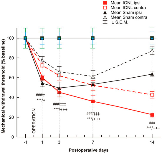 The graph shows the time course of mechanical sensitivity measured by the von Frey filaments in the ipsilateral and contralateral vibrissae pads of sham- and IONL-operated rats on postoperative days 1, 3, 7, and 14 compared to baseline assessment one day before the operation. The mechanical withdrawal threshold is presented as the mean percentage of baseline (%) ± SEM. Statistical significance was calculated using one-way ANOVA with repeated measures, followed by Bonferroni’s multiple-comparison tests; n = 8 in each group. *** indicates a statistically significant difference (p < 0.001) in the vibrissal pads ipsilateral to IONL compared to baseline; +/+++ indicates a statistically significant difference (p < 0.05/0.001, respectively) in the vibrissal pads contralateral to IONL compared to baseline; ### indicates a statistically significant difference (p < 0.001) in the vibrissal pads ipsilateral to sham operation compared to baseline; ‡/‡‡‡ indicates a statistically significant difference (p < 0.05/0.001, respectively) in the vibrissal pads contralateral to sham operation compared to the baseline.